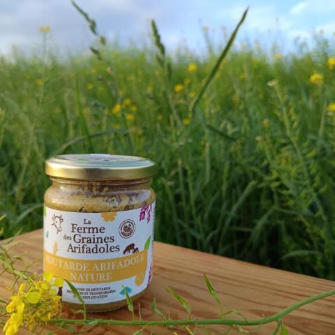La moutarde nature est cultivée, transformée, conditionnée à la ferme. Elle est réalisée avec les graines de moutardes brune dont le goût, prononcé, saura relever toutes vos recettes, grillades et plats cuisinés.